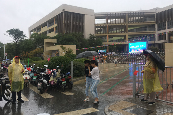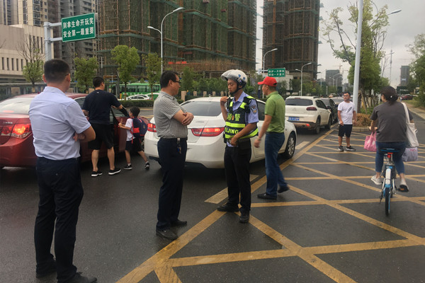 上午8时天空突降大雨,学校附近车流量与人流量暴增,给学生通过马路进入校园造成了安全隐患。社区党员志愿者和五老护学志愿者们积极行动,冒雨在幼儿园及小学门口开展交通疏导,引导学生家长文明有序的进入学校,城管和交警部门引导家长的车辆沿道路有序停放,使交通工作井然有序。