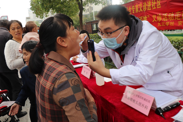 活动现场,来自安徽医科大学第四附属医院消化内科、内分泌科、肾内科、普外科、骨科、妇科、耳鼻喉科、心内科等科室的专家们耐心地为居民们进行义诊,详细了解病情,查看病症,提出治疗方案。针对病情复杂的居民,专家们详细查看病历和各项检查报告单,给出就医的指南,为居民解除了困惑,从而科学高效就医。此外,现场还为居民提供测量血压和血糖服务,专家们对多发病、慢性病进行初步筛查,讲解常见病防治方法,指导居民合理用药、日常预防。此次义诊持续近两个半小时,服务居民200余人次,受到居民的一致好评?!霸诩颐趴诰湍芸吹胶苣压业胶诺淖颐耪铮娴奶奖懔耍姨氐匕鸭依锩娴目诜?、片子都带过来了,张主任和我讲了很多注意事项,我都一一记下了,收获很大,真的太感谢了!”家住滨湖欣园小区的朱广凤老人这样说道。