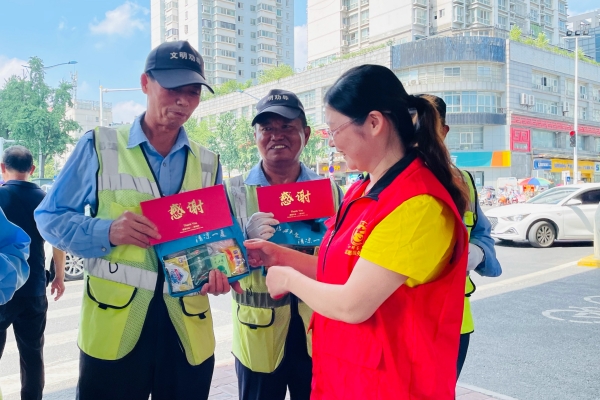 “您的辛苦付出,为城市生活提供了便利;您的坚守岗位、挥洒汗水,换来了城市的正常运转;您的无私奉献,守护住城市的洁净与安宁……”带着一封封感谢信,7月22日上午,包公街道富金商圈党委联合爱心企业安徽德勤人力资源有限公司开展了“红色引领送清凉 滴滴关怀沁人心”慰问一线户外工作者活动,为他们送去防暑降温用品。