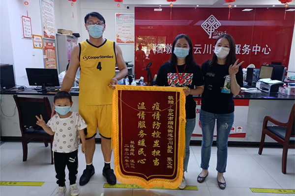 “应该的,这是我们的工作,也是我们的职责,大家都平平安安的就好。”张艾梅向前来送锦旗的居民笑着说。汪先生和徐先生是5月份从上海返肥的,由于当时疫情防控形式严峻复杂,云川辖区面积大、居民多,云川社区张艾梅和同事们一起,每天通过5+2、白+黑、24小时全时段工作,积极摸排上海来返人员,全程落实闭环管理。通过“一对一”、“多对一”细致包保、暖心服务,与他们建立电话和微信联系,提前告知最新防疫政策和通知,提醒他们严格落实各项防疫措施,有问题第一时间及时沟通处理。每天服务的居民多,风险大、工作任务重,她们却丝毫没有怨言,充当“守门员”、“宣传员”、“服务员”、“快递员”、“监督员”,及时进行政策宣传、信息摸排、缓解焦虑、物资输送、防疫检测等。看到居民舒心的笑容就是他们最开心的事,他们用实际行动践行着共产党员的责任和担当,用真情真心诠释着“守初心、践使命”的真谛,筑牢社区疫情防控“防火墙”。